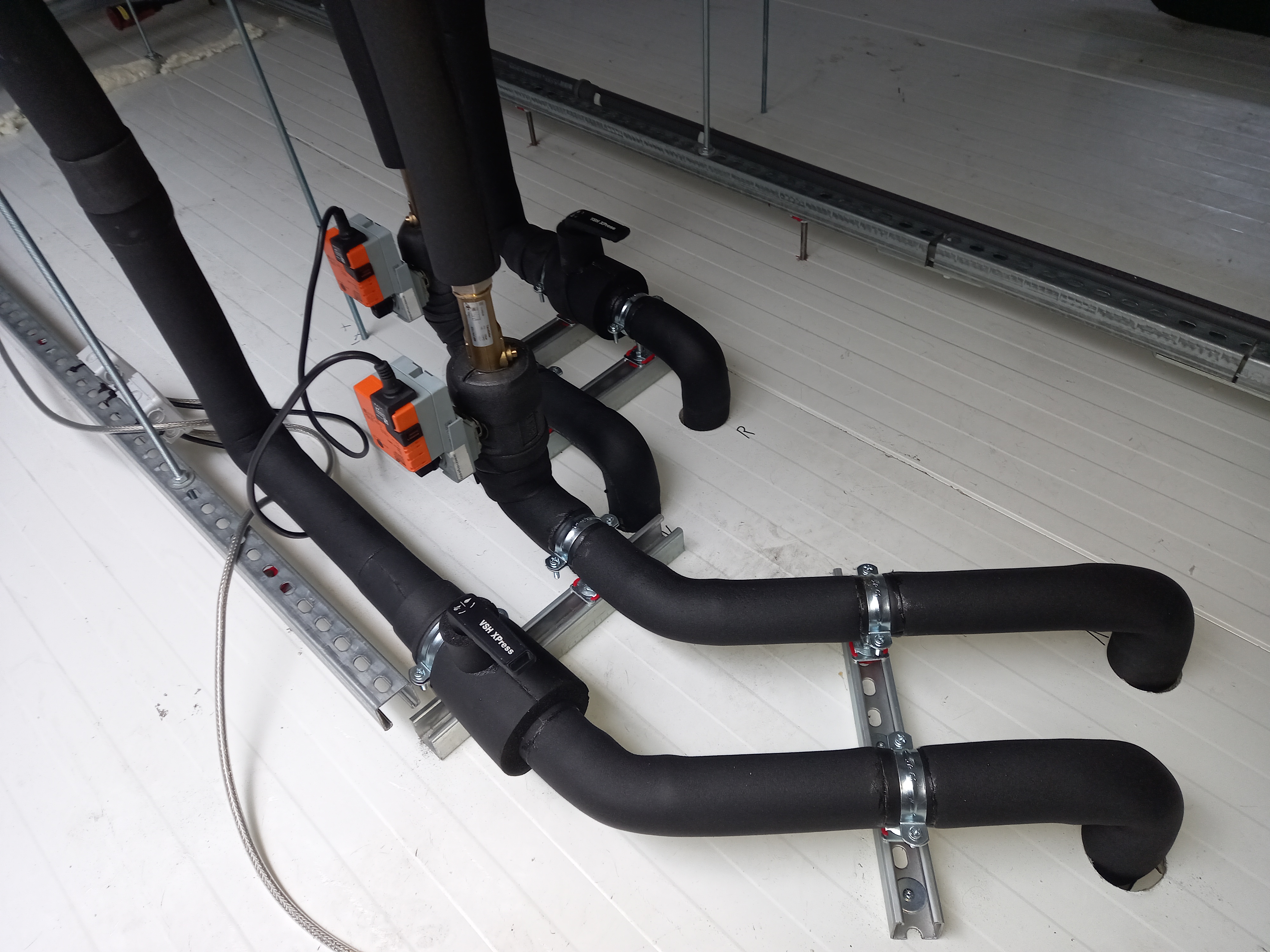 Aufgrund der Größe der Anlage haben wir uns für eine externe Kühleinheit entschieden, die uns eine ausreichende Kühlleistung von 180 kW mit der Möglichkeit zum Anschluss von 64 Inneneinheiten lieferte. Komplette Verteilungen sind in Edelstahlrohren mit Gummiisolierung durchgeführt. 59 Kassetten-Gebläsekonvektoren wurden für Büros und Sozialräume verwendet. Auf dem Dachboden befinden sich grundrissbedingt 5 weitere Attika-Gebläsekonvektoren.
